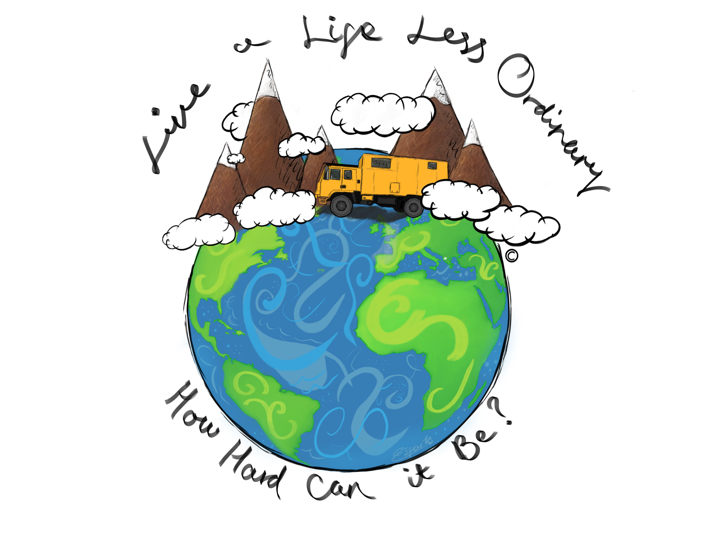 This is where we are now. The truck is about where we want it but tweaks continue. We have stopped working for a bit and were planning to head East in June this year toward The Stans, Mongolia and beyond into SE Asia. That is all about to change! We have recently identified a US insurance company (Thum) that will cover us for a year in Canada and the States, but only until the truck is a max of 30 years old. This is fairly unheard of in recent times and as it’s currently 28 this is the only time we could do this. To that end we have booked a very big boat to take our pride and joy from Liverpool (There were no options) to Halifax, Canada, at the end of June and we follow it out, on a plane, shortly after. The trip will begin. If anyone has any great ideas of what to do, see and visit please contact us. Hopefully there will be a GPS mapping page on here that shows our current location (Once we begin) and a vague route (Put together in an afternoon using Google maps) to take us from Canada to Mexico. The “East” route was a lot better planned but this is being thrown together as I type. Our Daughter, Erin, has designed and drawn our very own corporate image which takes pride of place on the side of the truck.